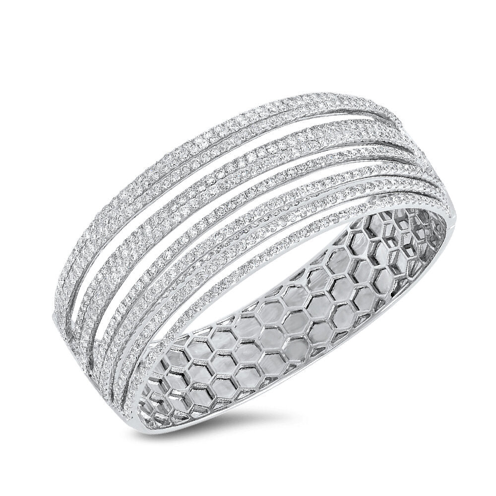 Add some sparkle to your wardrobe with this stunning 18K white gold diamond bangle. With 9.39 carats of round brilliant cut diamonds, it's the perfect accessory for any occasion. Elevate your look and make a statement of luxury and elegance.