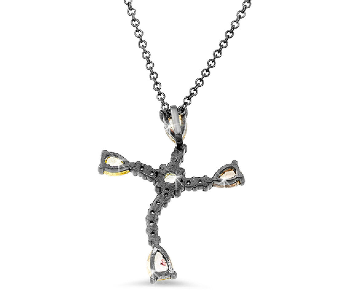 18K white gold black-rhodiumed cross pendant with 0.07 carat round brilliant cut diamonds and 0.43 carat rose cut diamonds.