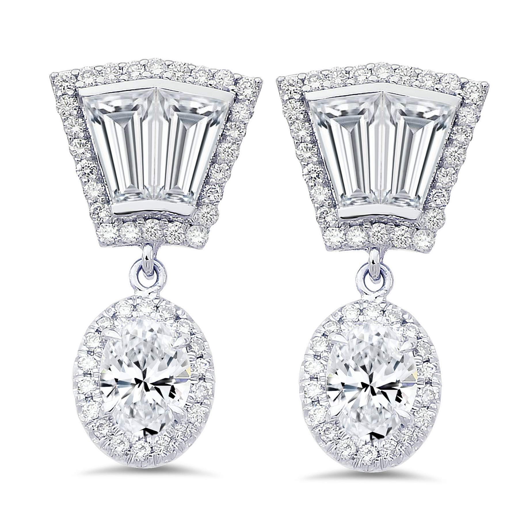 18K white gold earrings with 0.30 carat round brilliant cut diamonds, 0.75 carat baguette diamonds and 1.00 carat center oval diamonds.
