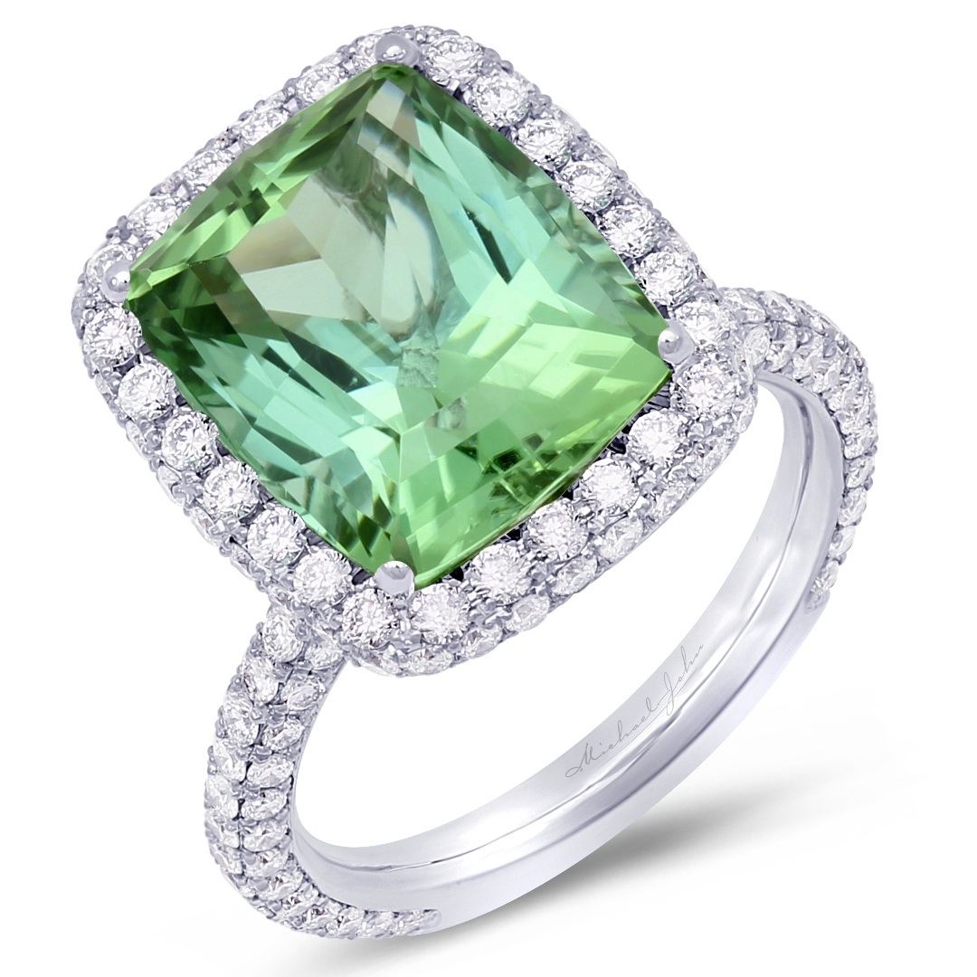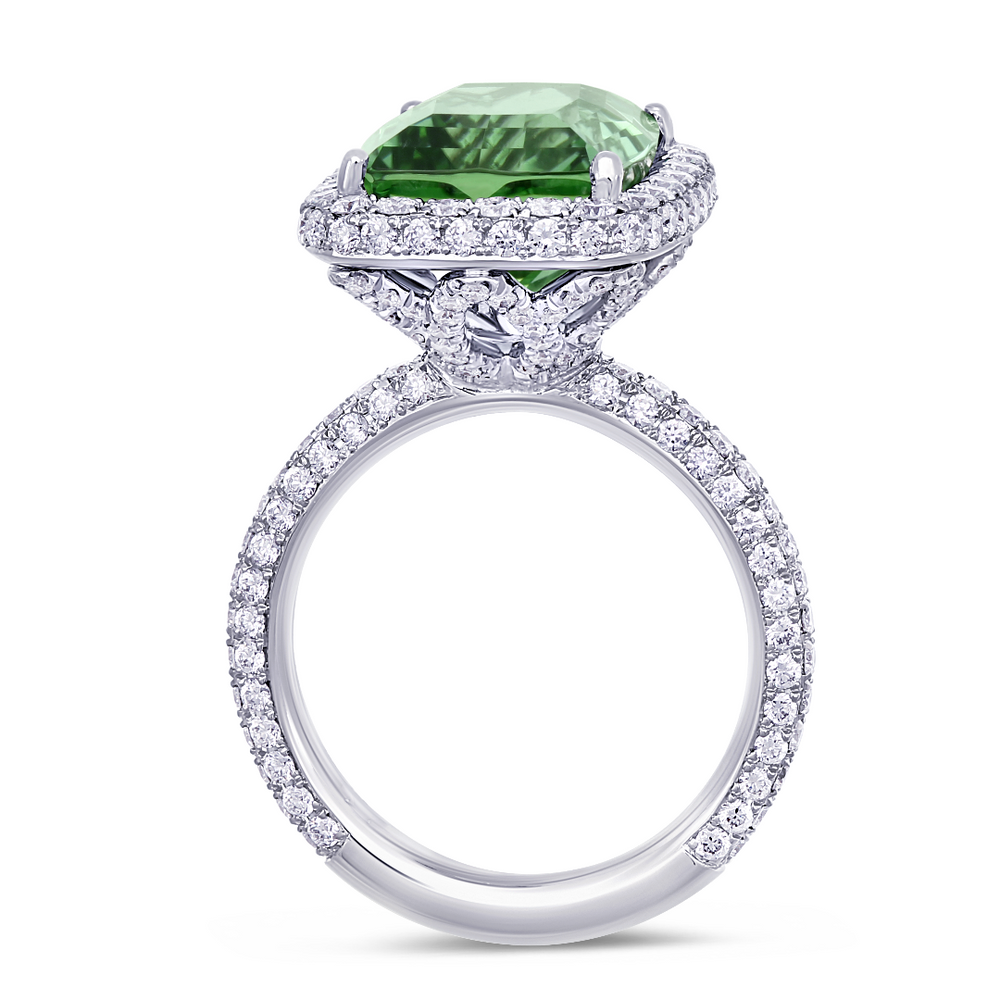 Handcrafted 18K white gold ring with a striking tourmaline centerpiece and diamond accents