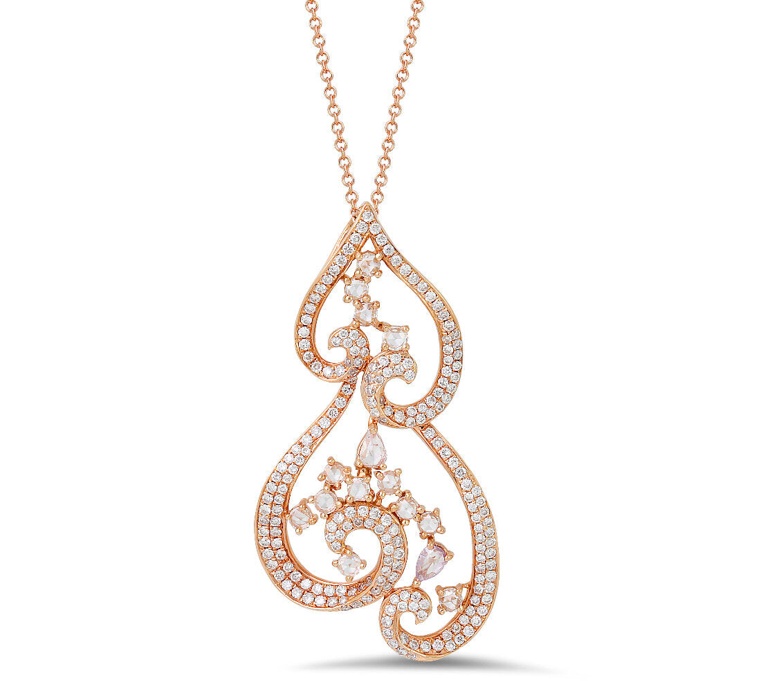 18K rose gold pendant with 0.71 carat round brilliant cut diamonds and 0.44 carat rose cut diamonds.