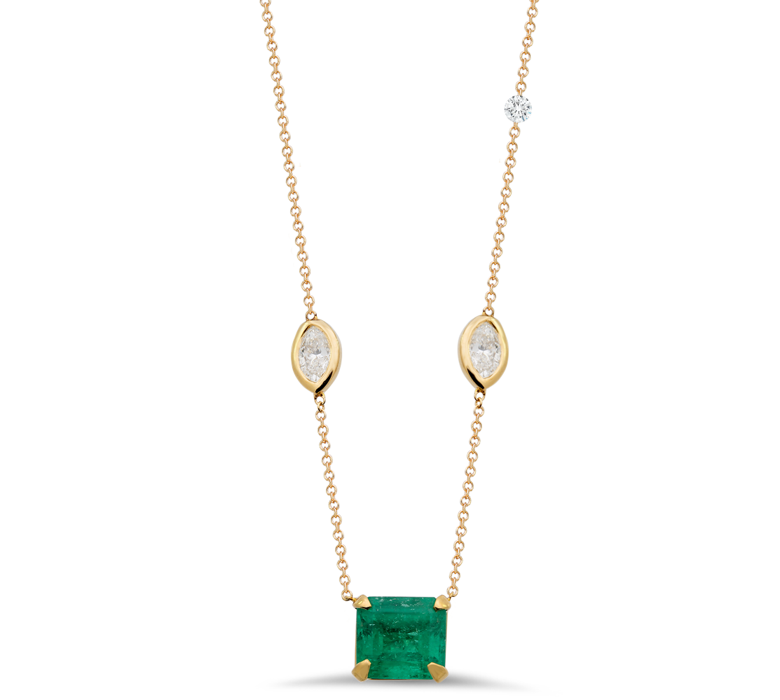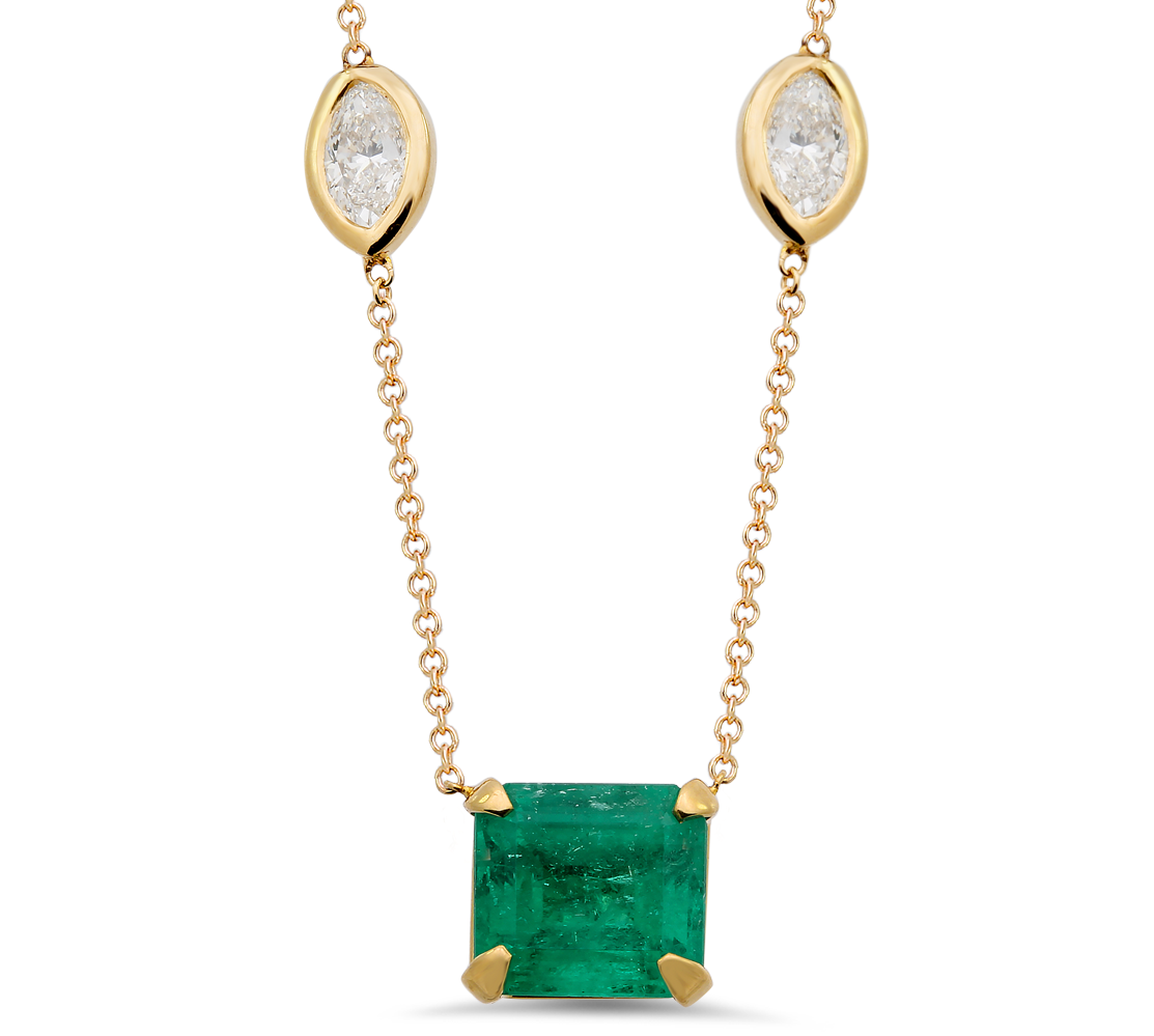 18K yellow gold pendant with 0.25 carat round brilliant cut diamonds, 0.55 carat marquise diamonds and 1.35 carat center emerald.
